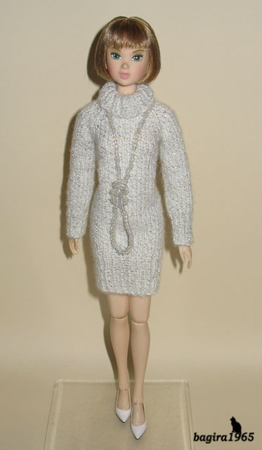 Дженифер, Дженни, Женька (как её окрестили Аделинка с Лилькой) - новенькая моя девочка (так мне нравится просто не сказать словами, появилась у меня благодаря Катюше - Мороженке): белое зимнее платье, связано из ниток с люрексом.